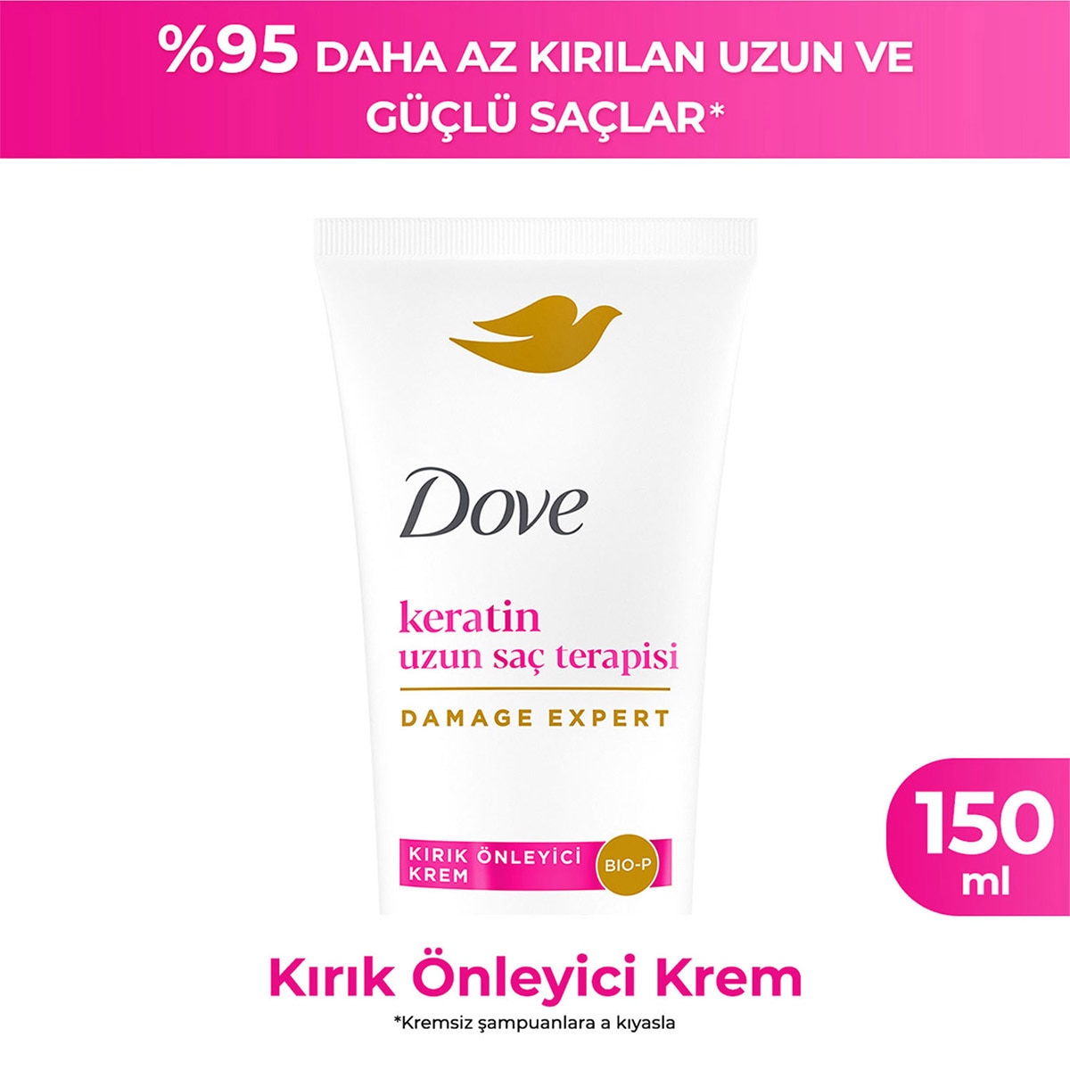 Dove Keratin Uzun Saç Terapisi Kırık Önleyici Krem 150 ml, Bio-Protein Care teknolojisiyle saçtaki protein kaybına karşı bakım sunar. Kolay kırılan saçlar için daha güçlü ve uzun saç görünümünü destekler.