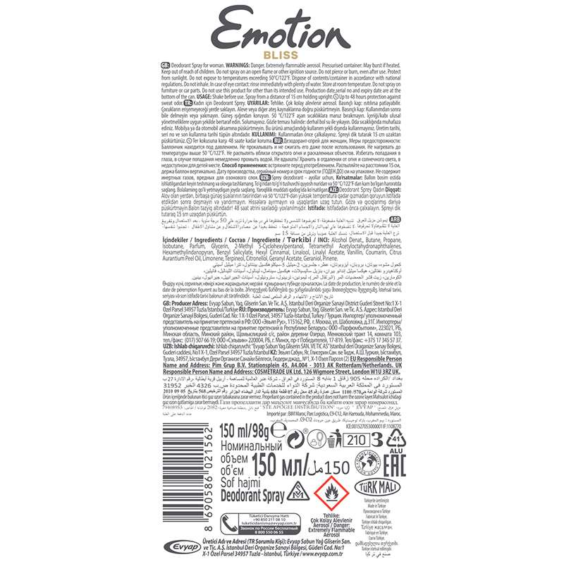 Emotion Deo Kadın Bliss 150ML 1. Emotion Bliss Nasıl Kullanılır? Ürünü temiz ve kuru koltuk altınıza 15 cm mesafeden püskürtün. Günlük kullanım için idealdir. Çalkalayarak kullanılması önerilir. 2. Emotion Bliss Ne İşe Yarar? Emotion Bliss Deodorant, alüminyum içermeyen ve vegan formülüyle cildinize nazikçe dokunur. 48 saate kadar ter kokusuna karşı etkili koruma sağlarken, gün boyu süren ferahlık sunar. Portakal çiçeğinin tazeleyici dokunuşu ve vanilyanın yumuşak sıcaklığıyla zarif, kadınsı bir kokuya sahiptir. Hızlı kuruyan ve iz bırakmayan yapısıyla kıyafetlerde leke oluşumunu engeller. Alüminyum içermez, bu özelliği sayesinde gözeneklerinizi tıkamadan ter kokusunu önler. 3. Emotion Bliss Kimler İçin Uygundur? Doğal içerikli ve alüminyum içermeyen ürünleri tercih eden, hafif ve etkileyici bir koku arayan kadınlar için idealdir. 4. Emotion Bliss Hangi Cilt Tipleri İçin Uygundur? Tüm cilt tipleri için uygundur. Günlük kullanım için geliştirilmiş formülüyle, normal cilt yapısına sahip kullanıcılar tarafından rahatlıkla kullanılabilir. Tahriş olmuş veya hasarlı cilt yüzeylerinde kullanılması önerilmez. 5. Emotion Bliss’in Etken Maddeleri Nelerdir? Alcohol Denat., Butane, Propane, Isobutane, Parfum, Glycerin, 2-Methyl 5-Cyclohexylpentanol, Tetramethyl Acetyloctahydronaphthalenes, Hexamethylindanopyran, Benzyl Salicylate, Hexyl Cinnamal, Linalool, Linalyl Acetate, Vanillin, Coumarin, Citrus Aurantium Peel Oil, Limonene, Terpineol, Citronellol, Geranyl Acetate, Geraniol, Pinene. 6. Emotion Bliss Ürün Size Nasıl Gelecek? Emotion Bliss, özel tasarımlı sprey tüp ambalajı ile kutusuz olarak gönderilecektir. Ürün üzerinde marka ve içerik bilgileri yer almakta olup, doğrudan kullanıma hazır şekilde sunulmaktadır. Tehlike. Çok kolay alevlenir aerosol. Basınçlı kap: ısıtılırsa patlayabilir. Çocukların erişemeyeceği yerde saklayın. Aleve veya diğer ateş kaynaklarına doğru püskürtmeyin. Basınçlı kap: Kullanımdan sonra bile delmeyin veya yakmayın. Güneş ışığından koruyun. 50 °C/122°F aşan sıcaklıklara maruz bırakmayın. İçeriği/kabı ulusal yönetmeliklere uygun şekilde bertaraf edin. Solumayınız. Gözle teması halinde: derhal bol su ile yıkayın. Oda sıcaklığında muhafaza ediniz. Mobilya ya da otomobil aksamına püskürtmeyin. Bu ürünü amaçlandığı kullanım şekli dışında kullanmayınız.