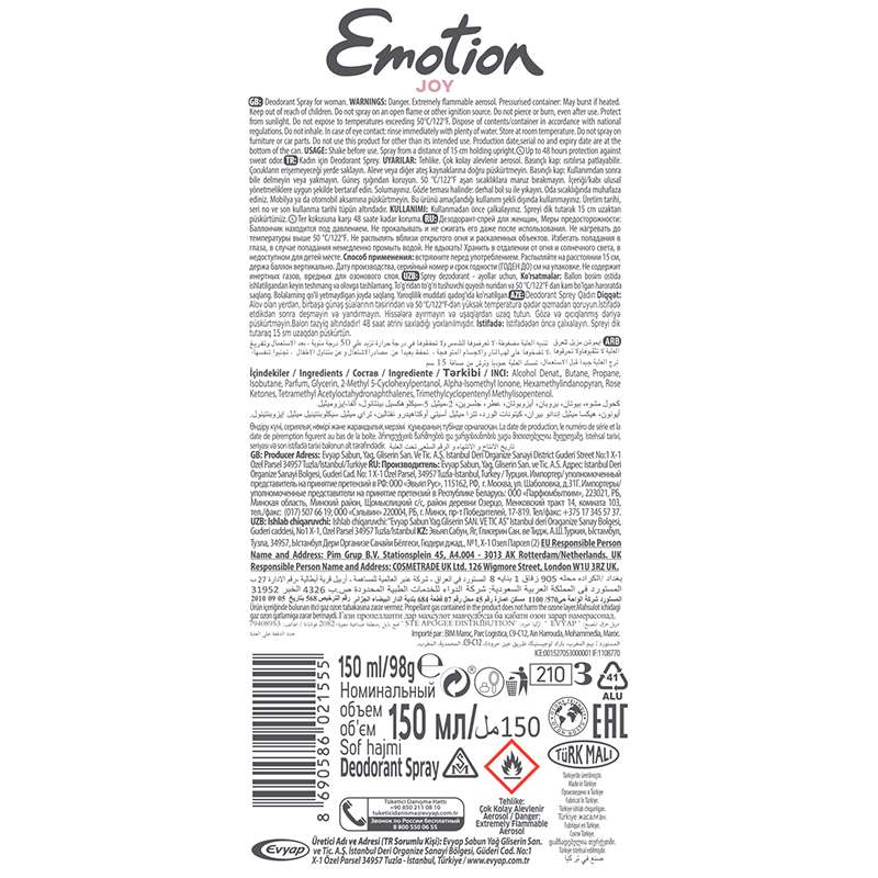 Emotion Joy, özel tasarımlı sprey tüp ambalajı ile kutusuz olarak gönderilecektir. Ürün üzerinde marka ve içerik bilgileri yer almakta olup, doğrudan kullanıma hazır şekilde sunulmaktadır.