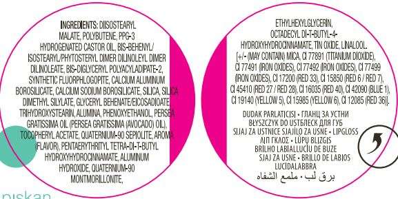INGREDIENTS : DIISOSTEARYL MALATE, POLYBUTENE, PPG-3 HYDROGENATED CASTOR OIL, BIS-BEHENYL/ISOSTEARYL/PHYTOSTERYL DIMER DILINOLEYL DIMER DILINOLEATE, BIS-DIGLYCERYL POLYACYLADIPATE-2, SYNTHETIC FLUORPHLOGOPITE, CALCIUM ALUMINUM BOROSILICATE, CALCIUM SODIUM BOROSILICATE, SILICA, SILICA DIMETHYL SILYLATE, GLYCERYL BEHENATE/EICOSADIOATE, TRIHYDROXYSTEARIN, ALUMINA, PHENOXYETHANOL, PERSEA GRATISSIMA OIL (PERSEA GRATISSIMA (AVOCADO) OIL), TOCOPHERYL ACETATE, QUATERNIUM-90 SEPIOLITE, AROMA (FLAVOR), PENTAERYTHRITYL TETRA-DI-T-BUTYL HYDROXYHYDROCINNAMATE, ALUMINUM HYDROXIDE, QUATERNIUM-90 MONTMORILLONITE, ETHYLHEXYLGLYCERIN, OCTADECYL DI-T-BUTYL-4-HYDROXYHYDROCINNAMATE, TIN OXIDE, LINALOOL. [+/- (MAY CONTAIN) MICA, CI 77891 (TITANIUM DIOXIDE), CI 77491 (IRON OXIDES), CI 77492 (IRON OXIDES), CI 77499 (IRON OXIDES), CI 17200 (RED 33), CI 15850 (RED 6 / RED 7), CI 45410 (RED 27 / RED 28), CI 16035 (RED 40), CI 42090 (BLUE 1), CI 19140 (YELLOW 5), CI 15985 (YELLOW 6), CI 12085 (RED 36)].