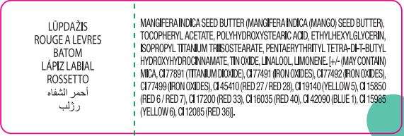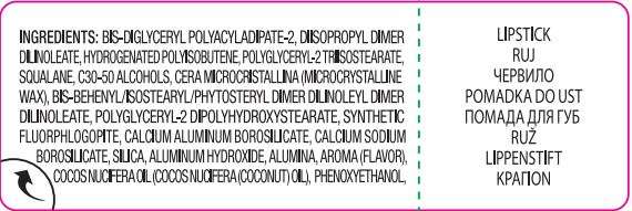 INGREDIENTS : BIS-DIGLYCERYL POLYACYLADIPATE-2, DIISOPROPYL DIMER DILINOLEATE, HYDROGENATED POLYISOBUTENE, POLYGLYCERYL-2 TRIISOSTEARATE, SQUALANE, C30-50 ALCOHOLS, CERA MICROCRISTALLINA (MICROCRYSTALLINE WAX), BIS-BEHENYL/ISOSTEARYL/PHYTOSTERYL DIMER DILINOLEYL DIMER DILINOLEATE, POLYGLYCERYL-2 DIPOLYHYDROXYSTEARATE, SYNTHETIC FLUORPHLOGOPITE, CALCIUM ALUMINUM BOROSILICATE, CALCIUM SODIUM BOROSILICATE, SILICA, ALUMINUM HYDROXIDE, ALUMINA, AROMA (FLAVOR), COCOS NUCIFERA OIL (COCOS NUCIFERA (COCONUT) OIL), PHENOXYETHANOL, MANGIFERA INDICA SEED BUTTER (MANGIFERA INDICA (MANGO) SEED BUTTER), TOCOPHERYL ACETATE, POLYHYDROXYSTEARIC ACID, ETHYLHEXYLGLYCERIN, ISOPROPYL TITANIUM TRIISOSTEARATE, PENTAERYTHRITYL TETRA-DI-T-BUTYL HYDROXYHYDROCINNAMATE, TIN OXIDE, LINALOOL, LIMONENE. [+/- (MAY CONTAIN) MICA, CI 77891 (TITANIUM DIOXIDE), CI 77491 (IRON OXIDES), CI 77492 (IRON OXIDES), CI 77499 (IRON OXIDES), CI 45410 (RED 27 / RED 28), CI 19140 (YELLOW 5), CI 15850 (RED 6 / RED 7), CI 17200 (RED 33), CI 16035 (RED 40), CI 42090 (BLUE 1), CI 15985 (YELLOW 6), CI 12085 (RED 36)].