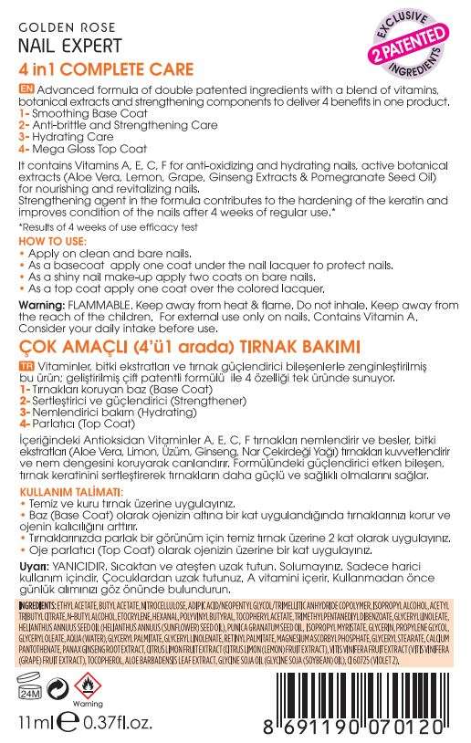 Golden Rose Nail Expert 4 in 1 Complete Care vitaminler, bitki ekstraktları ve tırnak güçlendirici bileşenlerle zenginleştirilmiş bu ürün ; geliştirilmiş çift patentli formülü ile 4 özelliği tek üründe sunuyor.