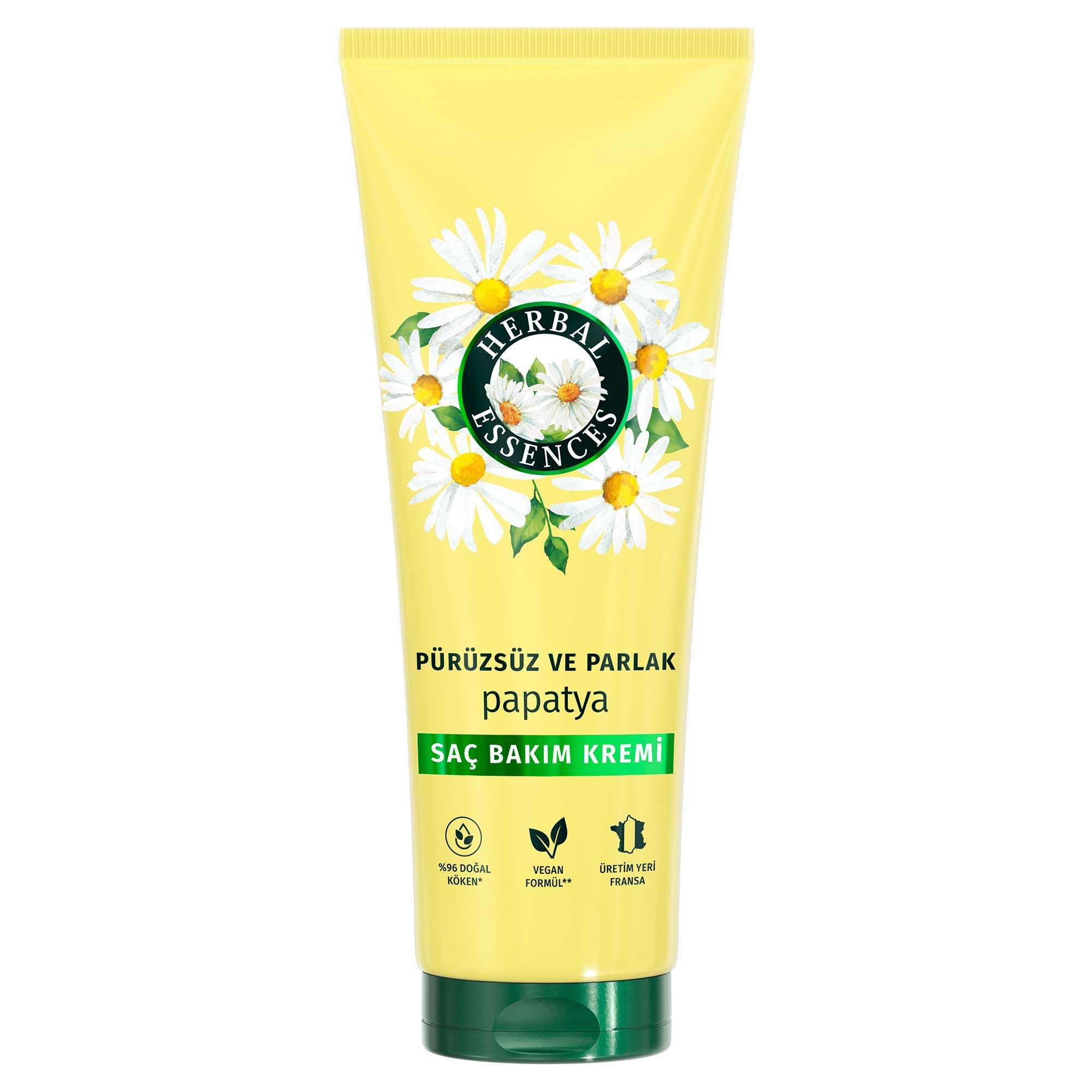 Herbal Essences Papatya Parlak & Pürüzsüz Saç Bakım Kremi ile saçlarınız doğanın bitkisel gücü sayesinde canlı bir parlaklık kazanır. Papatya özleri ile zenginleştirilmiş bu vegan saç kremi, saçlarınızı pürüzsüzleştirerek doğal parlaklığını ortaya çıkarır. Yaz bahçelerinin kokusunu içinize çekerek çiçeksi esintilerle canlandığınız saçlara kavuşun. Bitkisel besleyici özlerle zenginleştirilmiş ipeksi his sunan saç kremimiz, saçlarınıza muhteşem bir yumuşaklık ve ışıltı kazandırır. Bu krem hem duşta durulanabilir, hem de duş sonrası durulamadan kullanabileceğiniz biçimde formüle edilmiştir. Bu formül sayesinde, su tasarrufu sağlayarak hoş yaz esintileri kokusunun duş sonrasında da keyfini sürebilirsiniz. Özel olarak harmanladığımız doğal türevli bitkisel içeriklerin gücünü banyonuza getiriyoruz. Papatya Parlak & Pürüzsüz koleksiyonumuzdaki ürünlerle oluşturduğunuz bir saç bakım rutini ile tüm duyularınız harekete geçer ve saçlarınız doğal güzelliğini yeniden kazanır.