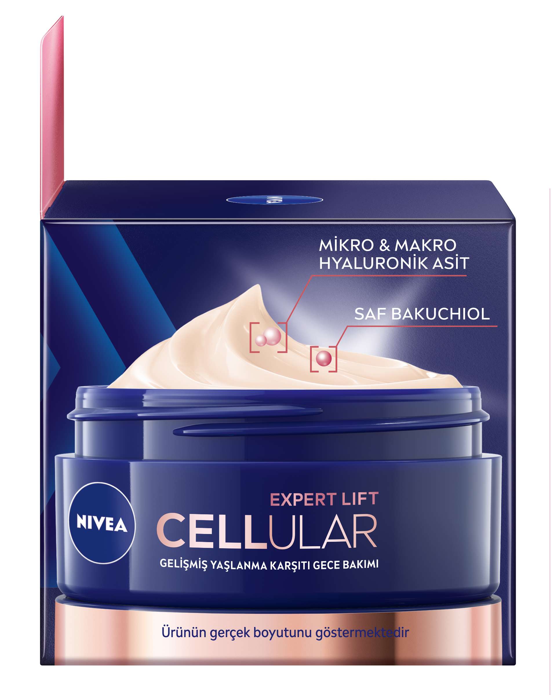 NIVEA Cellular Expert Lift Gelişmiş Yaşlanma Karşıtı Gece Kremi gelişmiş yaşlanma karşıtı formülümüyle daha genç görünen cildi ortaya çıkartmak için güçlü yaşlanma karşıtı içeriklerin bir kombinasyonunu içerir.