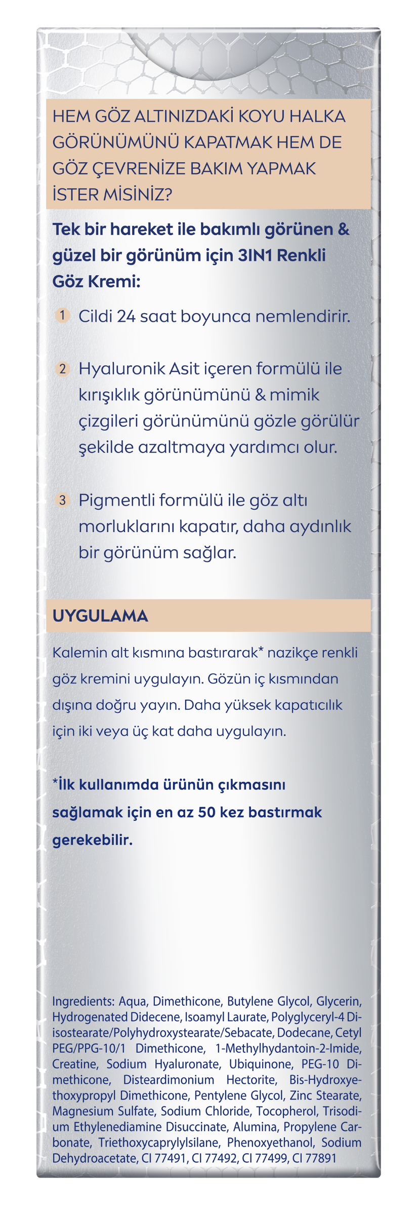Hem göz altınızdaki koyu halka görünümünü kapatmak hem de göz çevrenize bakım yapmak ister misiniz? 110 Yılı Aşkın Cilt Bakım Uzmanı NIVEA'dan Yeni NIVEA Hyaluron Cellular Filler Renkli Göz Bakım Kremi ile 3 etki 1 arada: 1. Yaşlanma Karşıtı Etki 2. 24 Saat Nemlendirme 3. Göz Altı Kapatıcısı Hyaluronik Asit içeren formülü ile kırışıklık görünümünü & mimik çizgileri görünümünü gözle görülür şekilde azaltmaya yardımcı olur. Tek hareket ile bakımlı görünen & güzel bir görünüm sağlar Cildi 24 saat boyunca nemlendirir. Pigmentli formülü ile morlukları kapatır, daha aydınlık bir görünüm sağlar. Renk tonu: Açık ton (01)