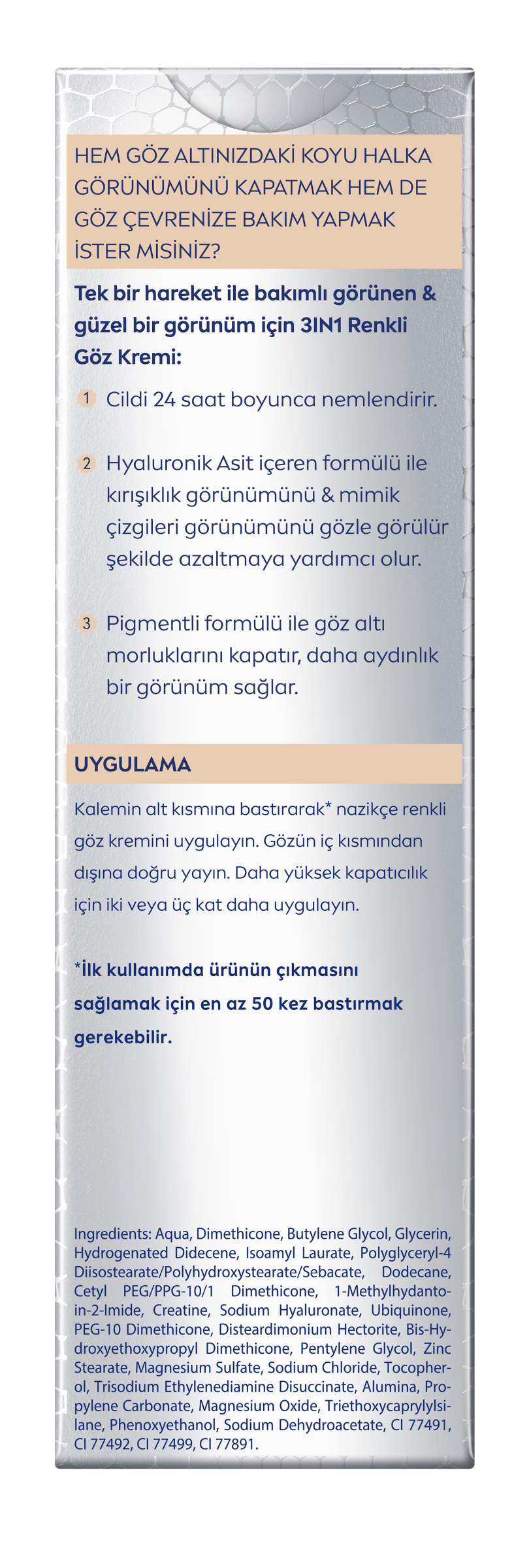 Hem göz altınızdaki koyu halka görünümünü kapatmak hem de göz çevrenize bakım yapmak ister misiniz? 110 Yılı Aşkın Cilt Bakım Uzmanı NIVEA'dan Yeni NIVEA Hyaluron Cellular Filler Renkli Göz Bakım Kremi ile 3 etki 1 arada: 1. Yaşlanma Karşıtı Etki 2. 24 Saat Nemlendirme 3. Göz Altı Kapatıcısı Hyaluronik Asit içeren formülü ile kırışıklık görünümünü & mimik çizgileri görünümünü gözle görülür şekilde azaltmaya yardımcı olur. Tek hareket ile bakımlı görünen & güzel bir görünüm sağlar Cildi 24 saat boyunca nemlendirir. Pigmentli formülü ile morlukları kapatır, daha aydınlık bir görünüm sağlar. Renk tonu: Orta ton (02)