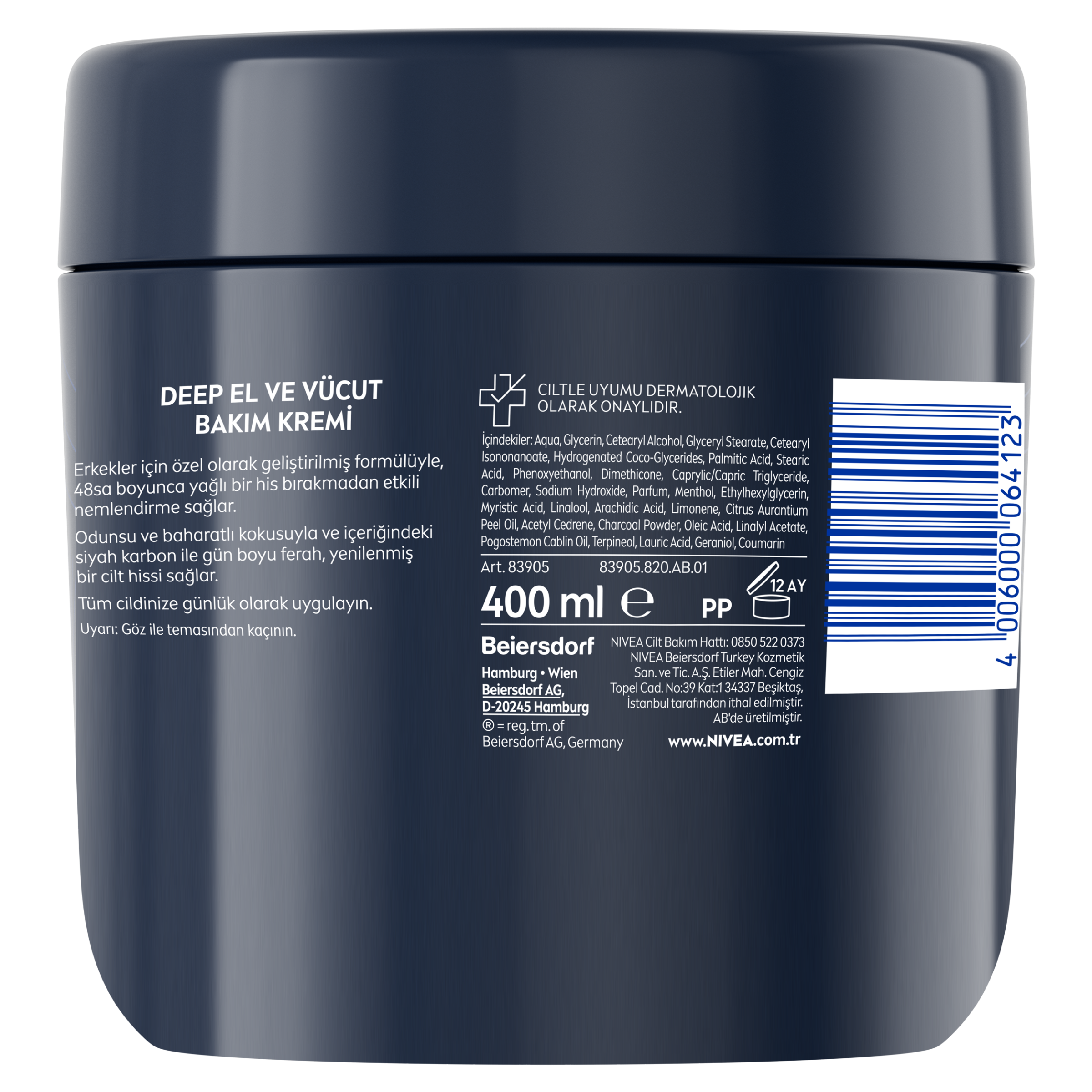 Bakımlı ve ferah bir cilt hissi için erkeklere özel Nivea Men Erkek Deep El ve Vücut Bakım Kremi 400 ml 48 Saat Nemlendirici 400 ml!