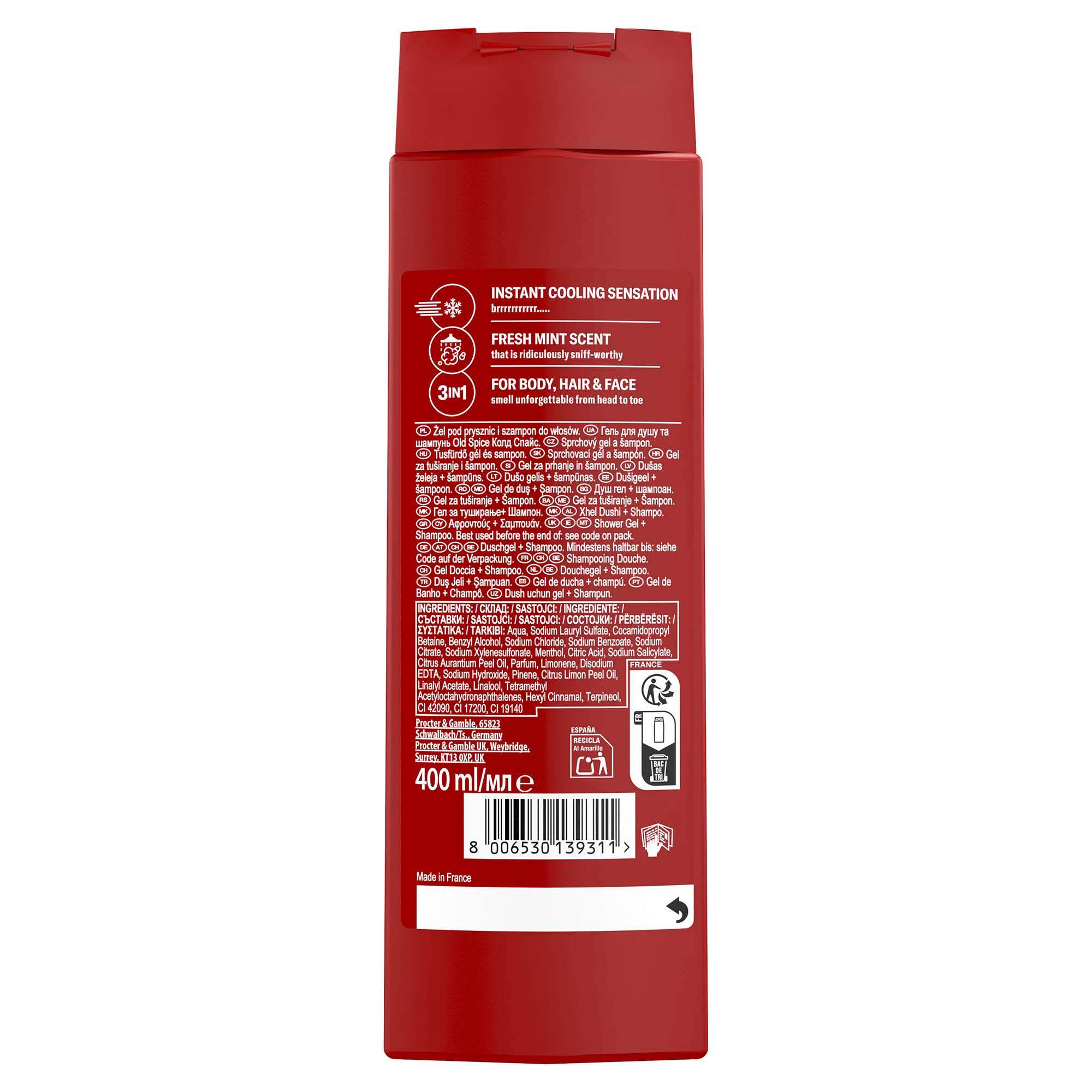 Aqua, Sodium Lauryl Sulfate, Cocamidopropyl Betaine, Benzyl Alcohol, Sodium Chloride, Sodium Benzoate, Sodium Citrate, Sodium Xylenesulfonate, Menthol, Citric Acid, Sodium Salicylate, Citrus Aurantium Peel Oil, Parfum, Limonene, Disodium EDTA, Sodium Hydroxide, Pinene, Citrus Limon Peel Oil, Linalyl Acetate, Linalool, Tetramethyl Acetyloctahydronaphthalenes, Hexyl Cinnamal, Terpineol, CI 42090, CI 17200, CI 1914