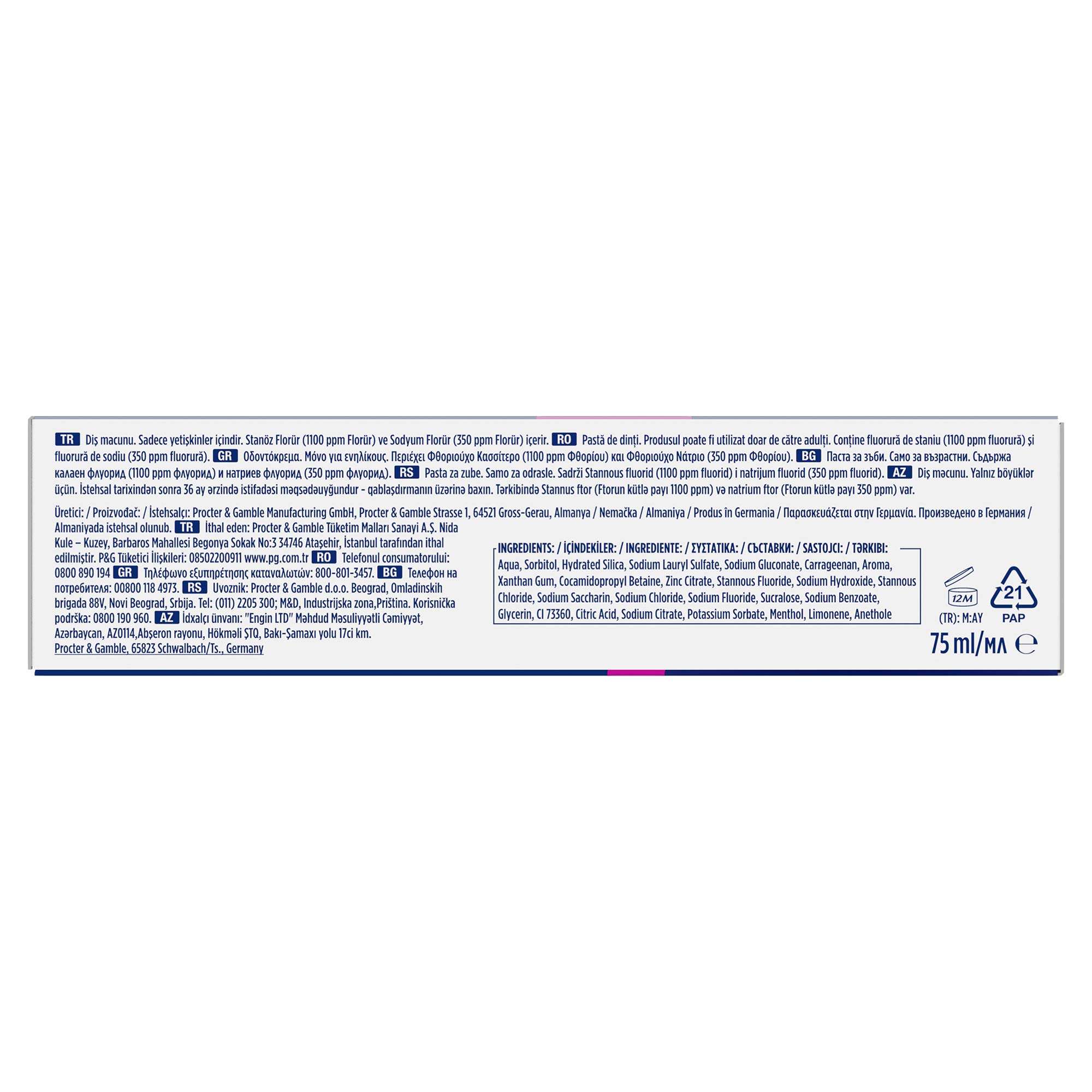 Aqua, Sorbitol, Hydrated Silica, Sodium Lauryl Sulfate, Sodium Gluconate, Carrageenan, Aroma, Xanthan Gum, Cocamidopropyl Betaine, Zinc Citrate, Stannous Fluoride, Sodium Hydroxide, Stannous Chloride, Sodium Saccharin, Sodium Chloride, Sodium Fluoride, Sucralose, Sodium Benzoate, Glycerin, CI 73360, Citric Acid, Sodium Citrate, Potassium Sorbate, Menthol, Limonene, Anethole.