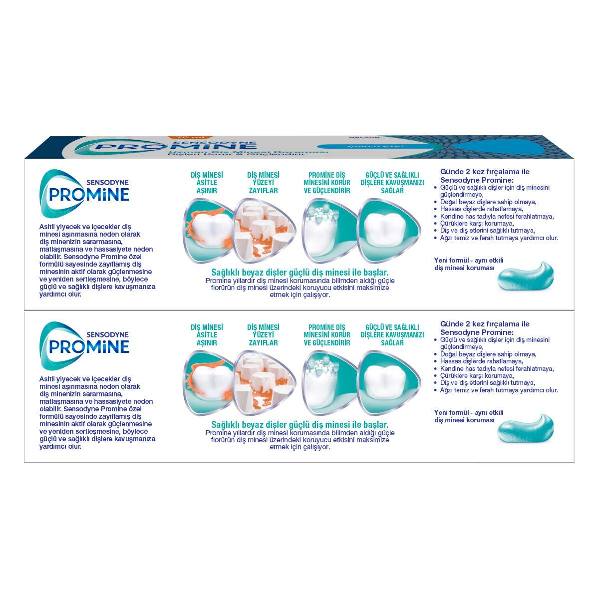 Sağlıklı oldukları için tükettiğimiz birçok besin asit içerir ve diş minesi yüzeyinin zayıflamasına sebep olabilir. Diş minesi altındaki sarı tabaka zamanla açığa çıkarak kademeli olarak diş minesi yüzeyi incelebilir. Sensodyne Promine Çoklu Etki diş macunu, zayıflamış diş minesini güçlendirmeye, diş eti sağlığını korumaya ve nefesi ferahlatmaya yardımcı olur*.