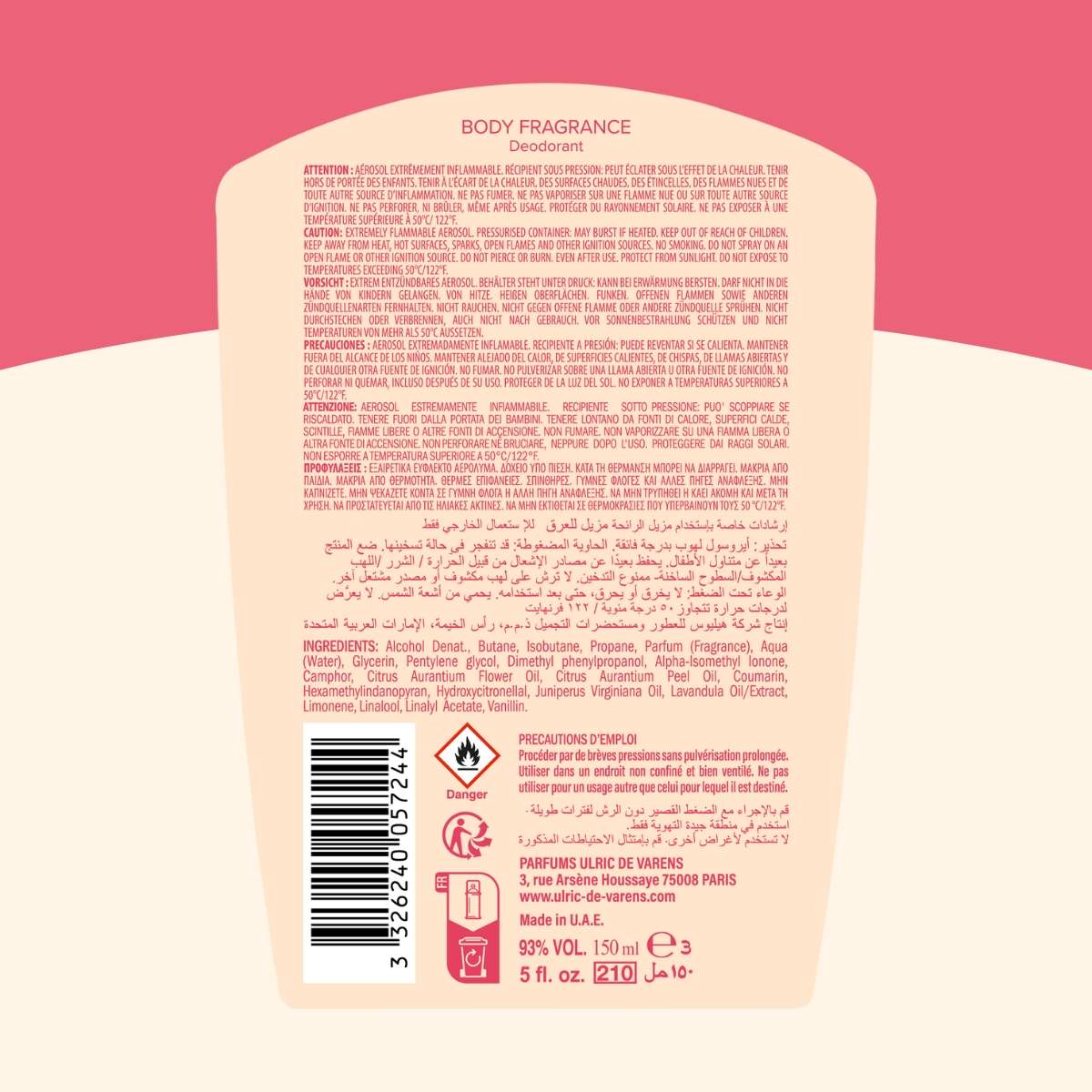 Alcohol Denat., Butane, Isobutane, Propane, Parfum (Fragrance), Aqua (Water), Glycerin, Pentylene glycol, Dimethyl phenylpropanol, Alpha-Isomethyl Ionone, Camphor, Citrus Aurantium Flower Oil, Citrus Aurantium Peel Oil, Coumarin, Hexamethylindanopyran, Hydroxycitronellal, Juniperus Virginiana Oil, Lavandula Oil/Extract, Limonene, Linalool, Linalyl Acetate, Vanillin.