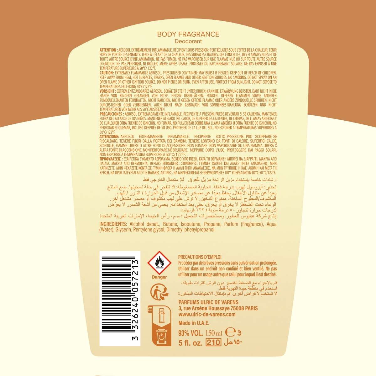 Alcohol denat., Butane, Isobutane, Propane, Parfum (Fragrance) Aqua (Water), Glycerin, Pentylene glycol, Dimethyl phenylpropanol.