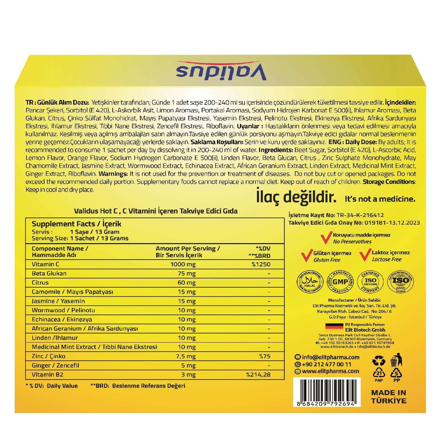 Validus Hot C7, C vitamini, çinko ve zengin bitkisel ekstreler içeren özel formülüyle sıcak içecek olarak tüketilen pratik bir takviye edici gıdadır. Saşe formu sayesinde günün her anında kolayca hazırlanabilir.